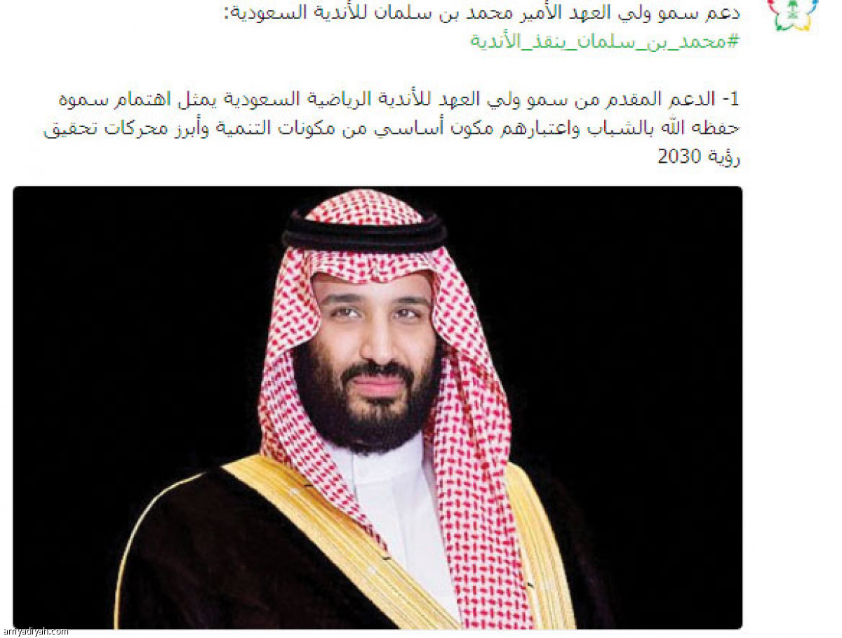 أطلقت الهيئة العامة للرياضة وسم #محمد_بن_سلمان_ينقذ_الأندية على حسابها الرسمي في موقع التواصل الاجتماعي “تويتر”، بعد أن قدم الأمير محمد بن سلمان، ولي العهد نائب رئيس مجلس الوزراء وزير الدفاع، دعماً مالياً شمل تسديد ديون الأندية السعودية الخارجية، ومستحقات لاعبي المنتخب السعودي المتأخرة من أنديتهم، والحكام الأجانب الموسم المقبل.