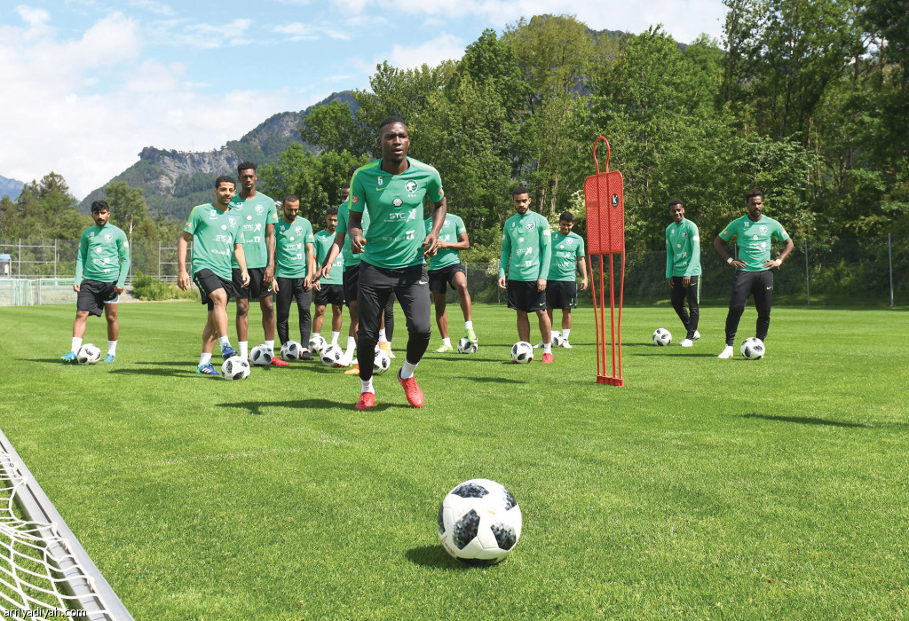 وكانت التدريبات الصباحية التي أجريت على ملاعب التدريب في مدينة بادرا غاز السويسرية قد بدأت بتمارين الجري حول الملعب، وبعدها فرض الجهاز الفني تمارين الإحماء والتحمل لمسافات متنوعة، قبل أن يعمد الأرجنتيني بيتزي مدرب الأخضر إلى تقسيم اللاعبين إلى مجموعات، حيث أجرى لكل مجموعتين مناورة في مساحات صغيرة بمشاركة حراس المرمى.