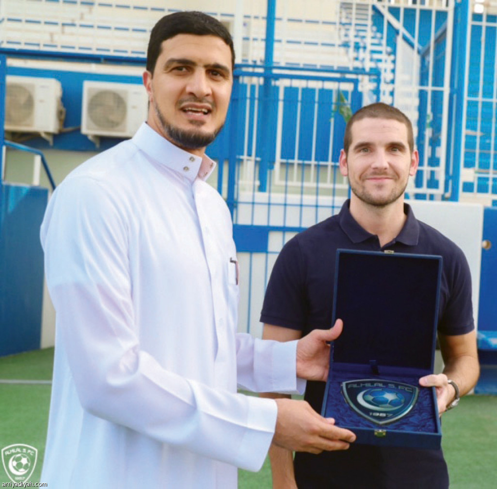 صورة التقطت لفهد المفرج يقدم هدية للفرنسي ماثيو (المركز الإعلامي ـ الهلال)