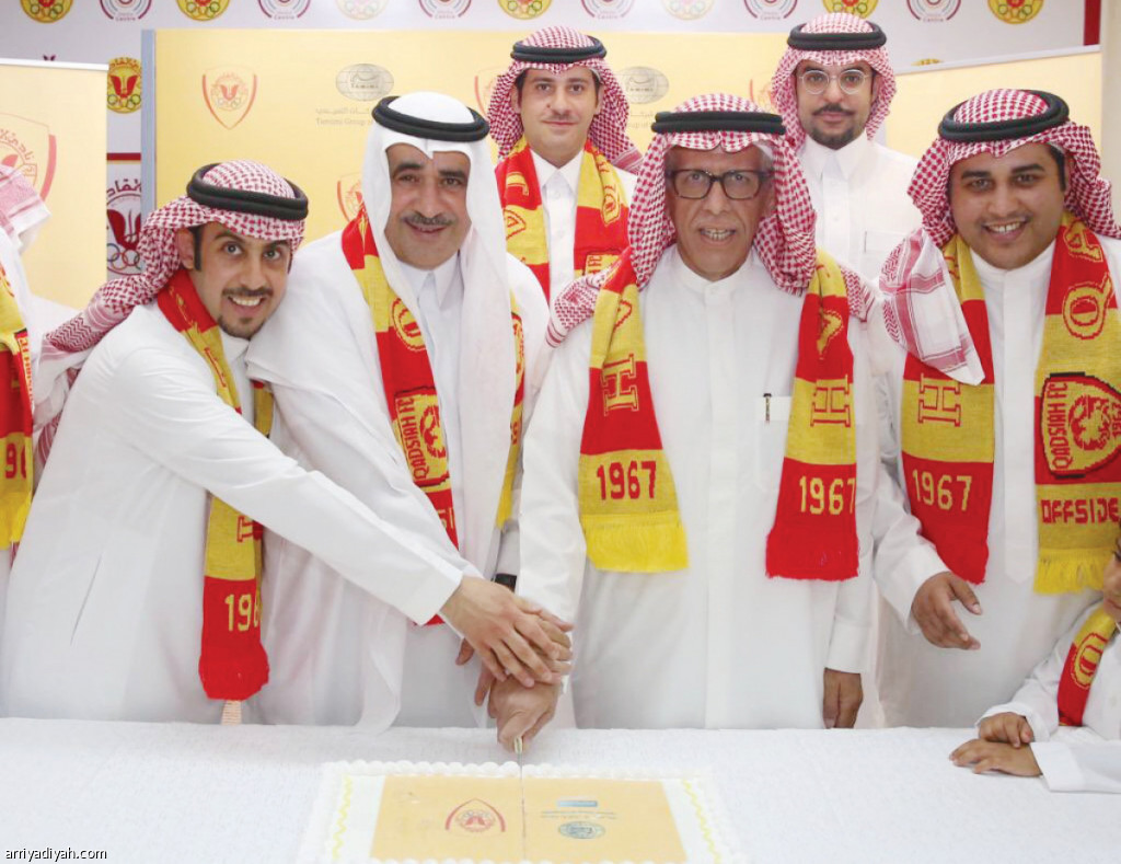 صورة التقطت أمس خلال تقطيع كعكة الاحتفالية بتوقيع عقد الراعي البلاتيني لنادي القادسية (المركز الإعلامي ـ القادسية)