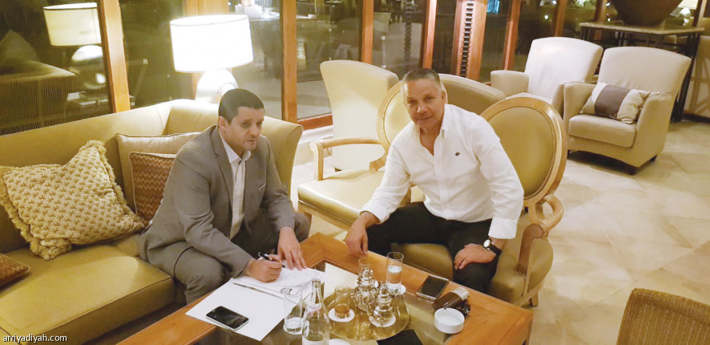 صورة التقطت أمس للحديثي خلال التوقيع مع الشابي (المركز الإعلامي - أبها)