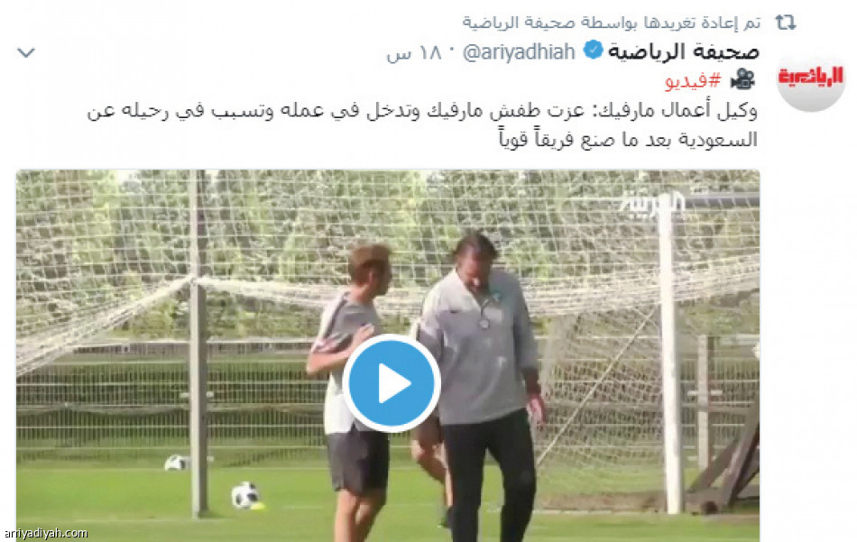 حصلت فيديوهات نشرتها "الرياضية" عبر حسابها في موقع التواصل الاجتماعي "تويتر"، من تصريحات مينو رايولا وكيل أعمال الهولندي مارفيك مدرب المنتخب السعودي، على تفاعل كبير من مستخدمي مواقع التواصل الاجتماعي.