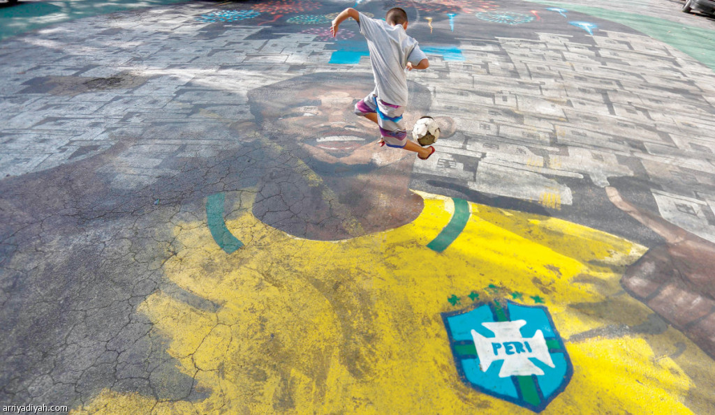 صورة التقطت أمس لصبي يلعب كرة قدم في شارع رسمت على أرضه صورة البرازيلي جابرييل جيسوس لاعب منتخب البرازيل في الحي الذي نشأ فيه في مدينة ساو باولو البرازيلية (الفرنسية)