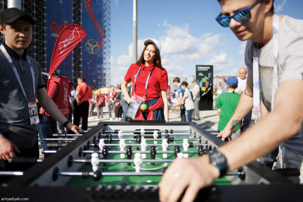 صورة التقطت أمس لشابين يلعبان كرة القدم على الطاولة قبل انطلاق مباراة السنغال واليابان على ملعب أكتنبرج (الفرنسية)