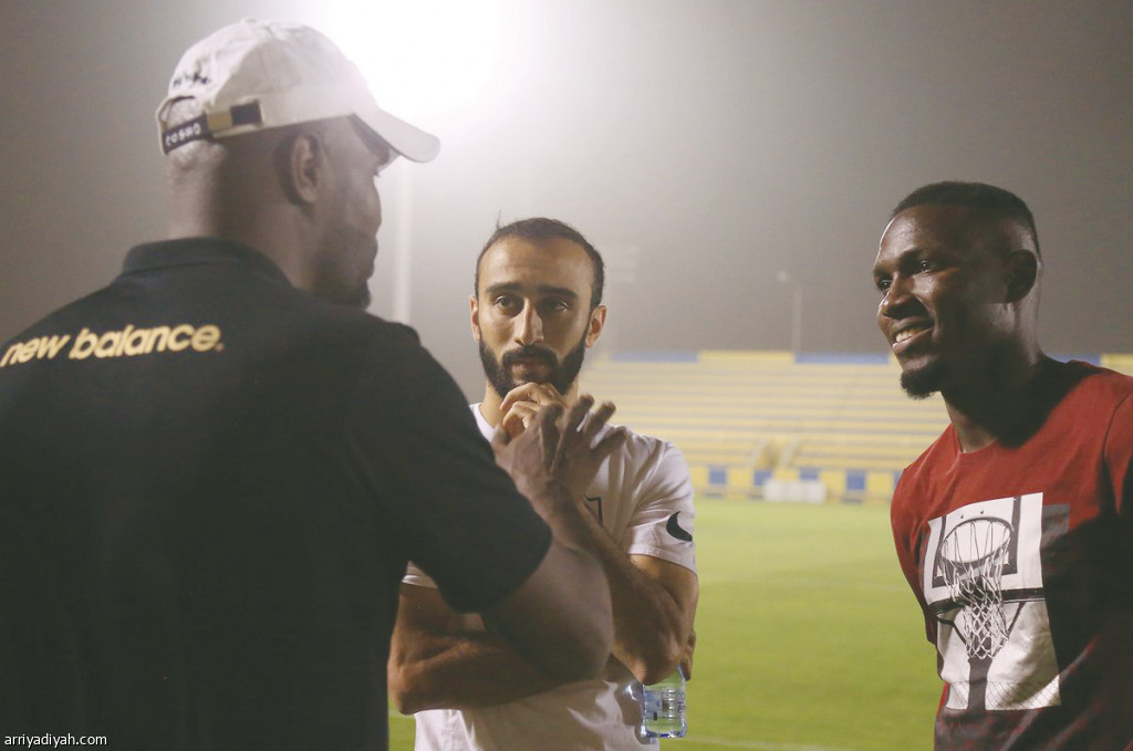 صور التقطت أمس للسهلاوي وهوساوي يتحدثان إلى محسن الحارثي مدير إدارة كرة القدم في النصر (المركز الإعلامي ـ النصر)