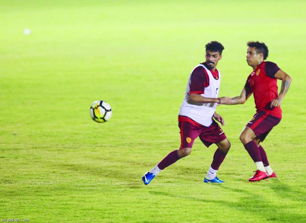 صورة التقطت لإلتون خوزيه وحسن العمري خلال تدريب القادسية المركز الإعلامي ـ القادسية)