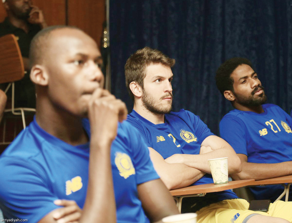 صورة التقطت أمس لبرونو أوفيني متوسطا عبد الله مادو وعوض خميس خلال محاضرة مسائية لفريق النصر الأول لكرة القدم ألقاها الحكم عبد المحسن الزويد لشرح التعديلات الجديدة على نظام التحكيم (المركز الإعلامي ـ النصر)