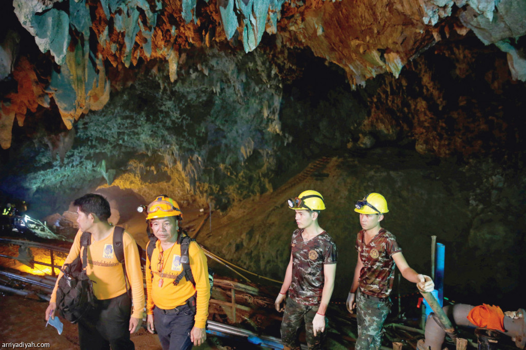 صورة التقطت أمس للعمال التايلانديين أثناء عملية إنقاذ أطفال فريق كرة القدم الذين تم احتجازهم في أحد الكهوف بعد أن غمرته مياه الأمطار (رويترز)