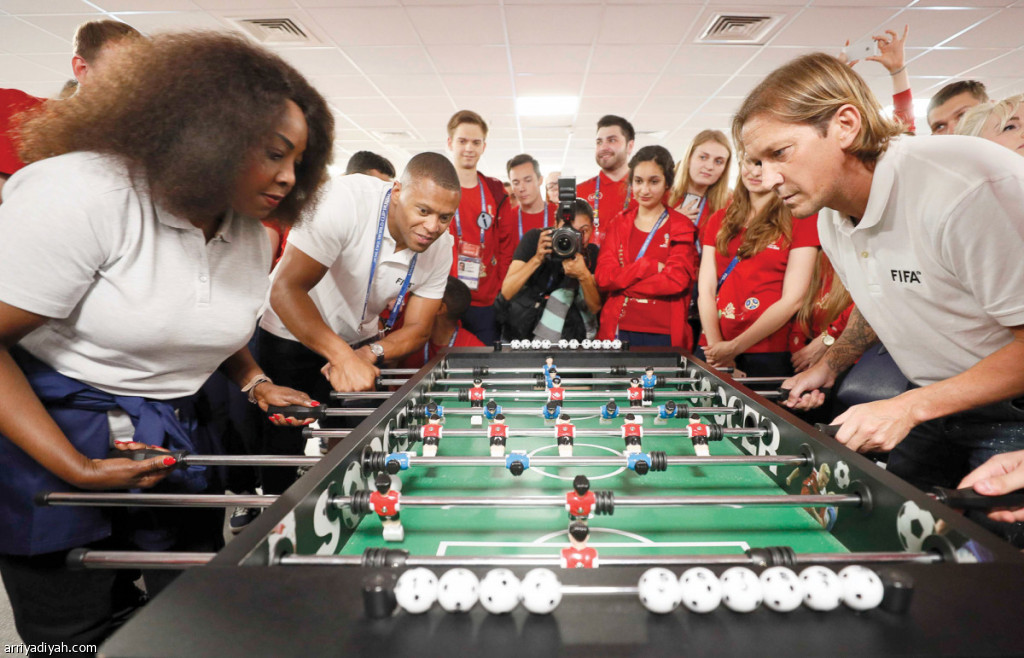 صورة التقطت لفاطمة سامورا الأمين العام للاتحاد الدولي لكرة القدم وميشال سالجادو اللاعب الإسباني السابق وجوليو بابتيستا اللاعب البرازيلي السابق يلعبون كرة القدم على الطاولة أو كما تسمى "فوزبول" أثناء حفل تكريم متطوعي كأس العالم في روسيا (أسوشيتدبرس)