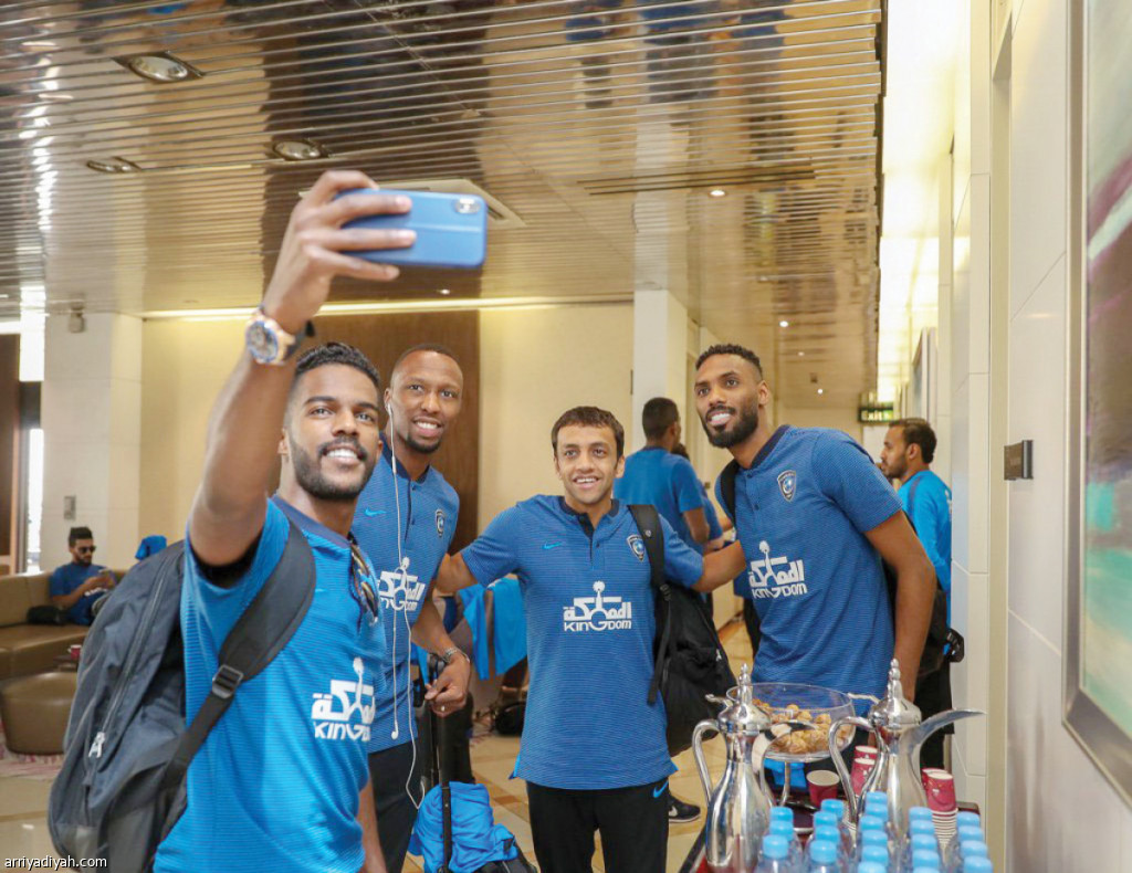 صورة التقطت أمس لنواف العابد لاعب الهلال يلتقط "سيلفي" بهاتفه المحمول مع زملائه محمد جحفلي ومحمد الشلهوب وحسن كادش (المركز الإعلامي ـ الهلال)
