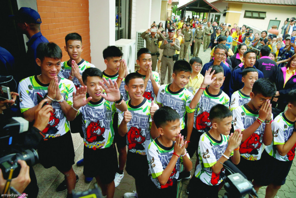 ولوح أمس 12 فتى هم أعضاء فريق ناشئين لكرة القدم ومدربهم وابتسموا وحيوا الناس أمس في أول ظهور علني لهم منذ إنقاذهم. وقال مسؤولون إن الأطفال والمدرب سيجيبون عن أسئلة أرسلها الصحفيون مسبقاً.