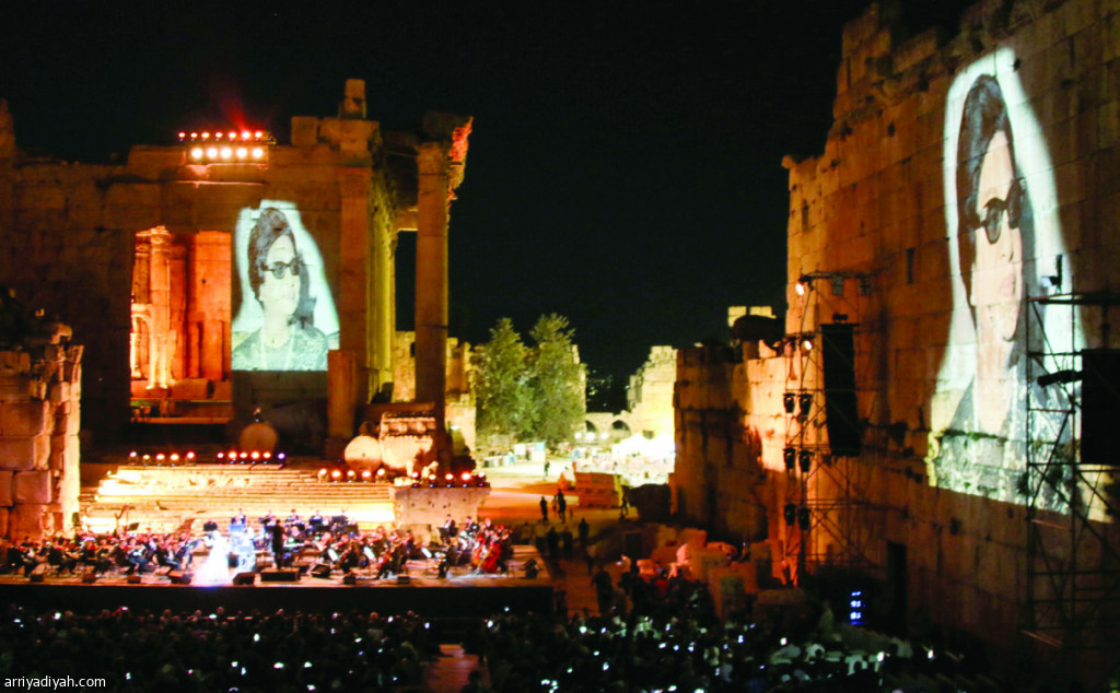 اعتلى طيف الفنانة الراحلة أم كلثوم مسرح باخوس على مدارج بعلبك بعد ثمانية وأربعين عاما على آخر ظهور لها في قلعة بعلبك الأثرية بشرق لبنان، حيث ارتفعت صورها عاليا مع شال معصمها الدائم لتعلن الانطلاق الرسمي لمهرجانات بعلبك الدولية هذا العام.