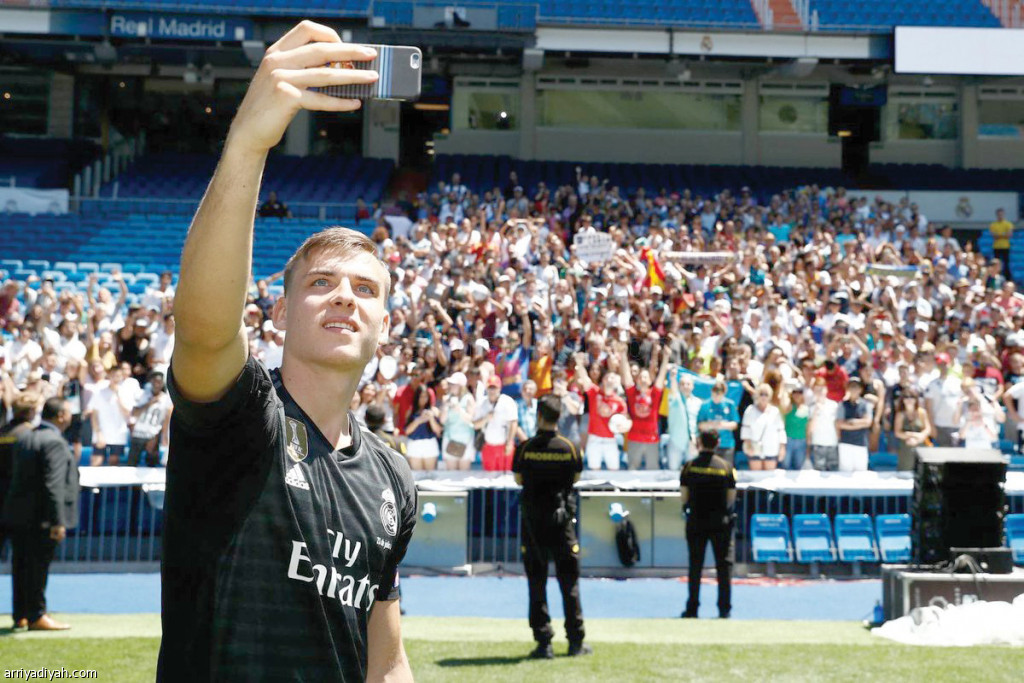 صورة التقطت أمس لأندريه لونين الحارس الأوكراني المنضم لريال مدريد الإسباني يلتقط صورة بهاتفه الخاص مع جمهور النادي الحاضر في مدرجات ملعب سانتياجو برنابيو للترحيب به (رويترز)