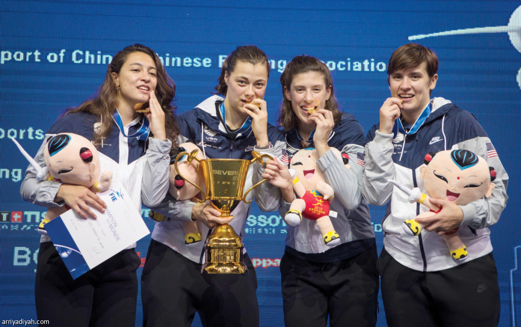 صورة التقطت للاعبات فريق المبارزة الأمريكي كاثرين هولمز وكورتني هيرلي وكيلي هيرلي وأماندا شيريكو يحتفلن بتحقيق الميدالية الذهبية ولقب كأس العالم للمبارزة للسيدات في البطولة التي احتضنتها مدينة ووشي الصينية (أسوشيتدبرس)
