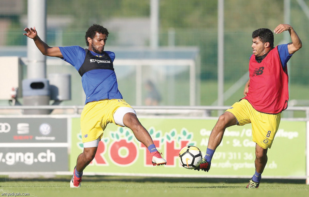 صورة التقطت أمس ليحيى الشهري وخالد الشويع يتنافسان على الكرة خلال تدريبات النصر في معسكره الحالي في سويسرا (المركز الإعلامي ـ النصر)