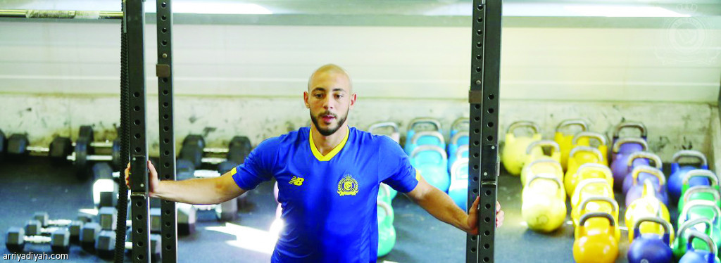 صورة التقطت أمس للمغربي نور الدين أمرابط لاعب النصر خلال أدائه تمارين لياقية داخل صالة حديد في مقر معسكر سانت جالين(المركز الإعلامي ـ النصر)