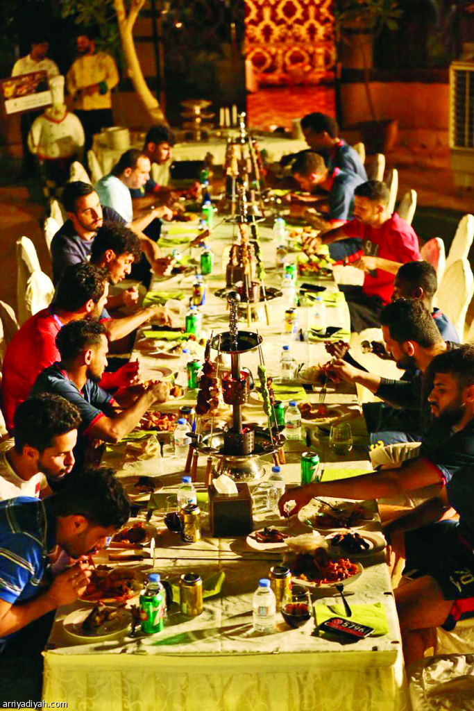 صورة التقطت في ساعة مبكرة أمس للاعبي الحزم خلال عشاء نظمته الإدارة في منتجع الطاووس بالقصيم تصوير: فهد البطاح