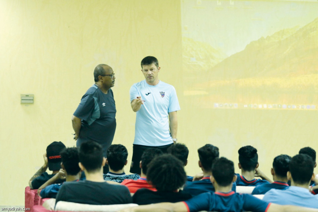صورة التقطت أمس للروماني دانييل إيسايلا مدرب فريق الحزم الأول لكرة القدم خلال اجتماع مع اللاعبين بحضور طبيب الفريق قبل يوم من المغادرة إلى الرياض ومنها إلى النمسا صباح الأحد لخوض معسكر إعدادي(المركز الإعلامي - الحزم)