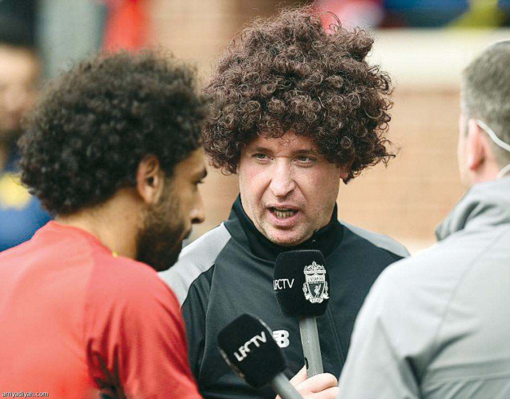 صورة التقطت أمس لروبي فولر المذيع الإنجليزي يجري مقابلة مع محمد صلاح لتلفزيون نادي ليفربول مرتدياً شعراً مستعاراً يشبه شعر اللاعب المصري (المركز الإعلامي ـ ليفربول)