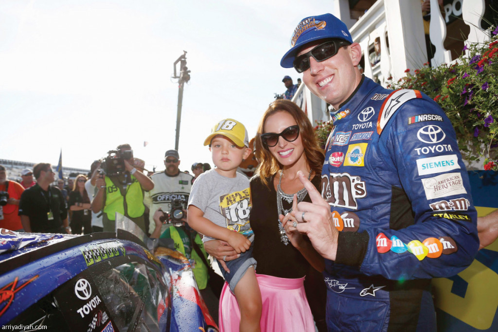 صورة التقطت لكايل بوش سائق إم آند إمز كاراميل تويوتا مع سامانثا زوجته وبريكستون ابنهما يلتقطون صورة بعد فوز بوش في مونستر إنرجي ضمن سباقات كأس ناسكار في مدينة لونج بوند بولاية بنسلفانيا الأمريكية (الفرنسية)