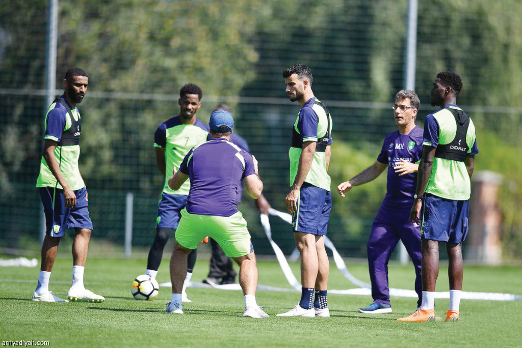 صورة التقطت أمس للرباعي دجانيني وعمر السومة وسلمان المؤشر ومهند عسيري لاعبي فريق الأهلي الأول لكرة القدم يستمعون إلى توجيهات مساعد المدرب خلال التدريبات في معسكر الفريق الجاري في النمسا (المركز الإعلامي ـ الأهلي)