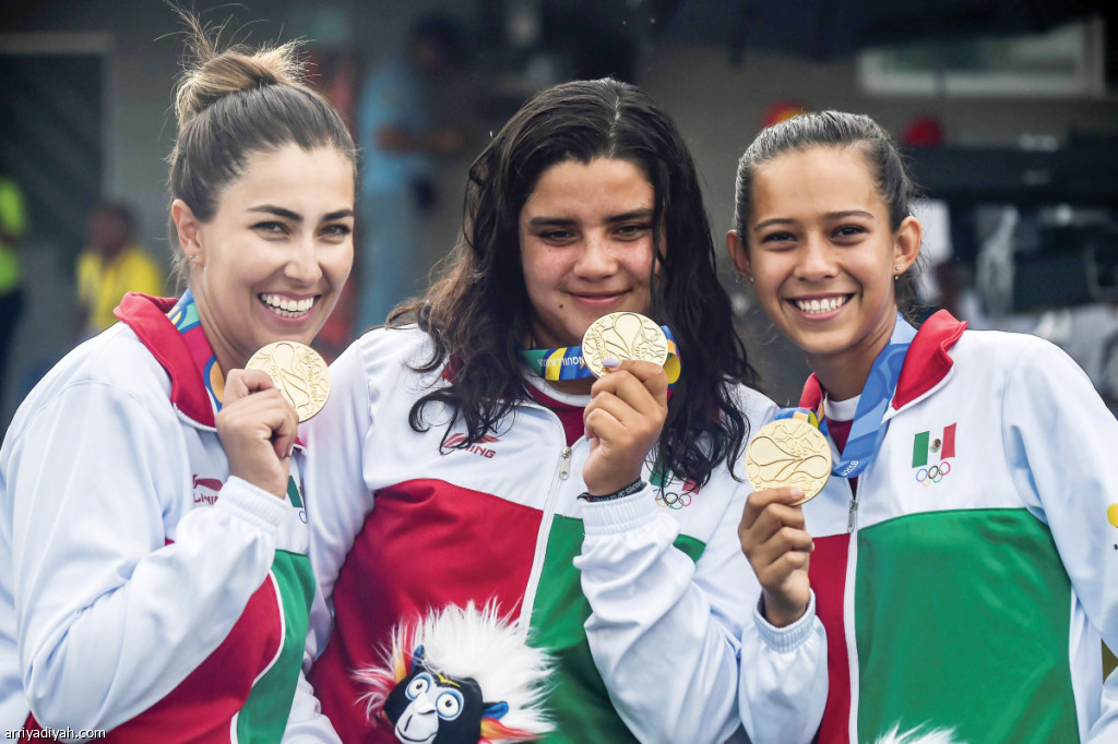 صورة التقطت لليندا أوتشوا وأندريا بيسيرا وإسمرالدا سانشيز لاعبات منتخب المكسيك للرماية يحتفلن بفوزهن بالميدالية الذهبية للرماية في نهائي السيدات بدورة ألعاب أمريكا الوسطى والكاريبي والجارية حالياً في مدينة بارانكويلا الكولومبية (الفرنسية)