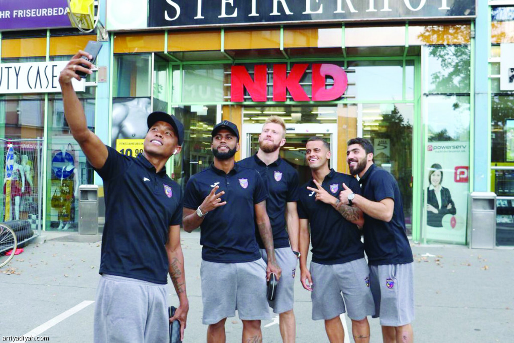 صورة التقطت أمس للخماسي قلفا وفلاح وروديلفو واليماو ومورالها لاعبي فريق الحزم يلتقطون سيلفي خلال الجولة الحرة في مدينة جراتس النمساوية (المركز الإعلامي ـ الحزم)