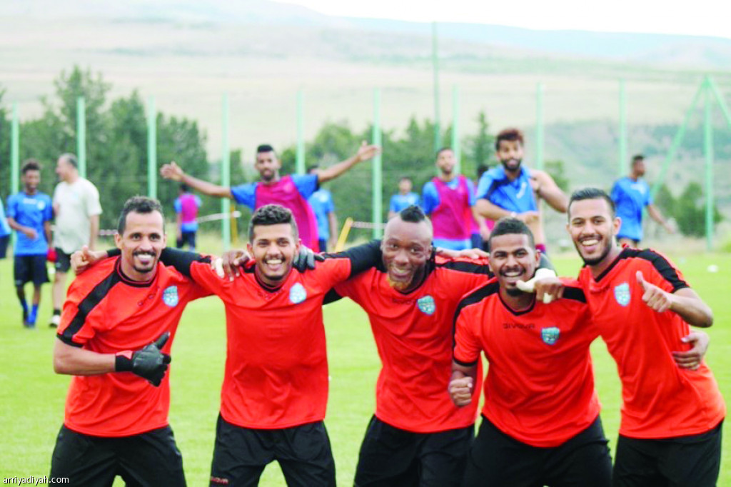 صورة التقطت أمس لحراس النهضة الخمسة فيصل المرقب وأبو ملحة والنيجيري زاوي هوزتالين وأحمد الشهري وعلي الحبيل قبل بداية الحصة التدريبية في جورجيا (المركز الإعلامي ـ النهضة)