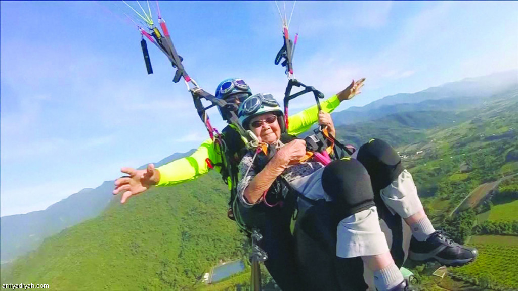 كانت العجوز التايوانية وو روي لين "93 عاما" تبتسم وتلوح بيديها وهي تحلق في السماء المفتوحة خلال جولة طيران مظلي في مدينة تايتونج في تايوان.