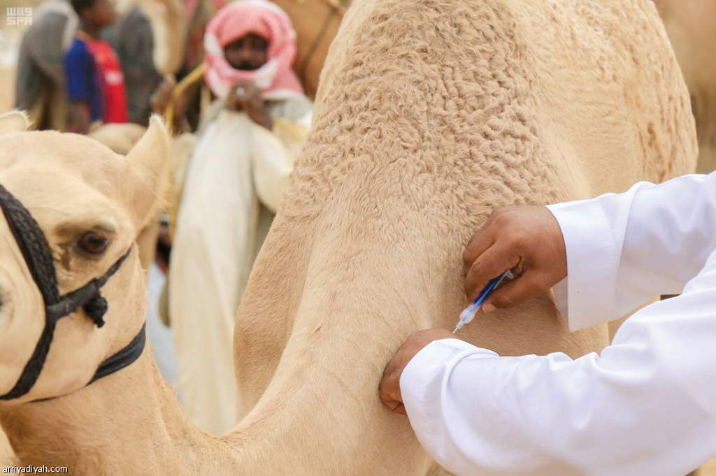 صورة التقطت أمس لأحد المختصين أثناء تركيب الشريحة الأمنية الإلكترونية للهجن المشاركة في المهرجان (واس)