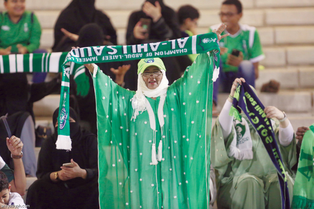 صورة التقطت أمس لمشجعة أهلاوية تتفاعل مع فريقها خلال المناورة تصوير: عدنان مهدل