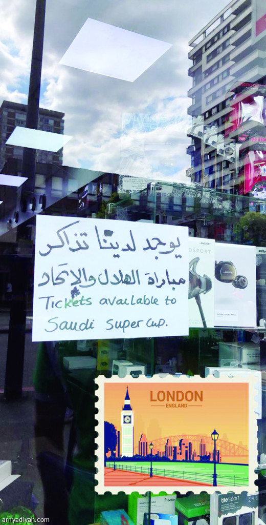 سيطرت أجواء مباراة كأس السوبر السعودي التي ستجمع فريقي الهلال والاتحاد بعد غد السبت على شوارع لندن من خلال وجود الكثير من السياح والجماهير السعودية التي ستحضر اللقاء، إذ طرح عدد من المحال التجارية خاصة في "شارع العرب" تذاكر اللقاء للبيع، كما وضعت بعض المطاعم أعلام الفريقين، وعلقت بعض العربات السياحية شعارات وأعلام الهلال والاتحاد.
