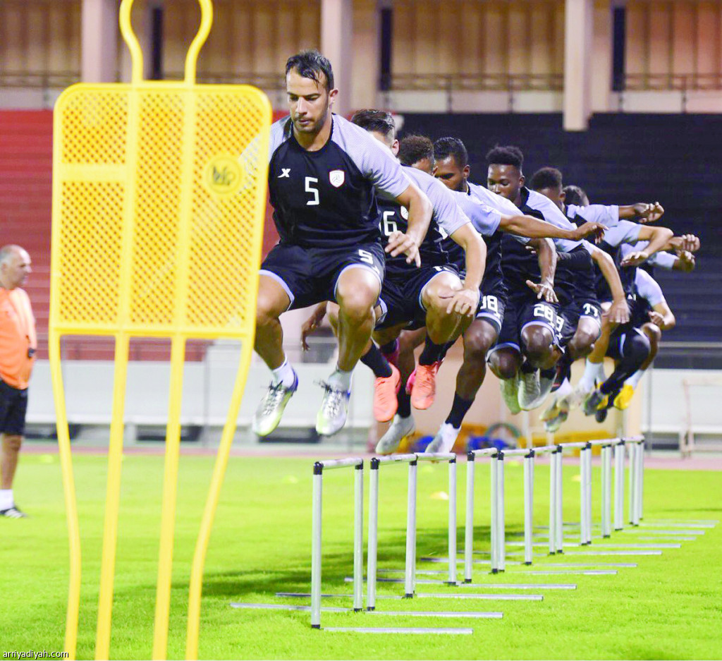 صورة التقطت أمس للاعبي الشباب يؤدون تدريبات القفز على الحواجز (المركز الإعلامي ـ الشباب)