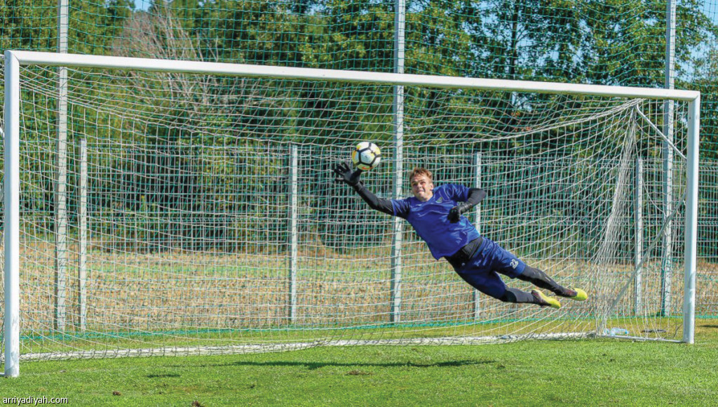 صورة التقطت أمس للأوكراني ماكسيم كوفال حارس الفتح يطير في الهواء ليلتقط الكرة في تدريبات فريقه (المركز الإعلامي ـ الفتح)