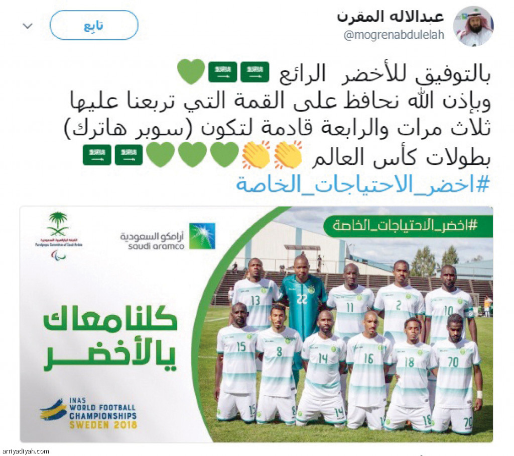 وغرد عبد الإله المقرن عضو اللجنة البارالمبية السعودية في الهاشتاق قائلا: "بالتوفيق للأخضر الرائع وبإذن الله نحافظ على القمة التي تربعنا عليها ثلاث مرات والرابعة قادمة لتكون سوبر هاترك بطولات كأس العالم".