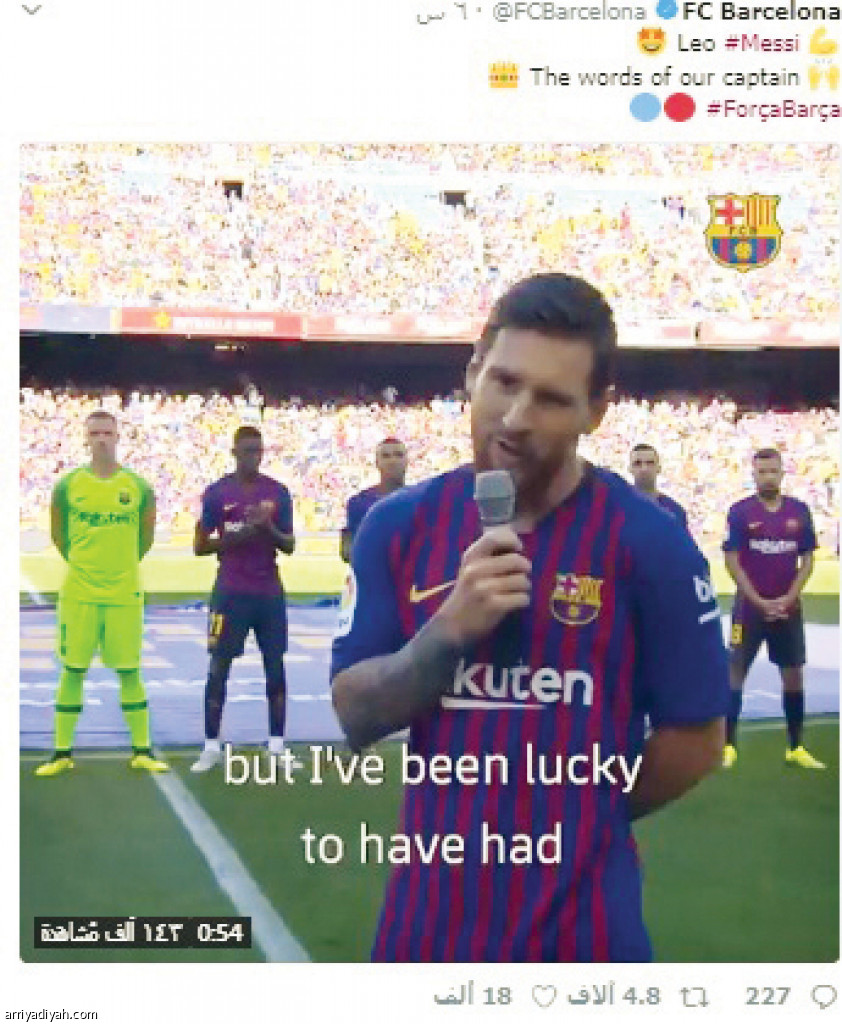 سجل الفيديو الذي بثه حساب نادي برشلونة الإسباني أمس الخميس لكلمة ليونيل ميسي قائد الفريق، خلال مراسم تقديم اللاعبين التي سبقت مباراة كأس خوان جامبر أمام بوكا جونيورز الأرجنتيني، 143 ألف مشاهدة خلال 6 ساعات فقط، وحصد الفيديو كذلك على 18 ألف إعجاب و4.8 ألف إعادة تغريد، و227 تعليقا.