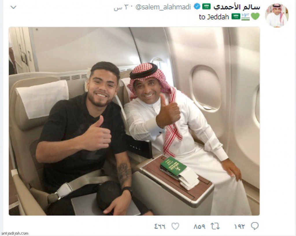 نشر سالم الأحمدي مدير المركز الإعلامي في النادي الأهلي، على حسابه في “تويتر” صورة تجمعه مع باولو دياز اللاعب التشيلي الجديد وهما على الطائرة متجهين إلى جدة، وعلق الأحمدي في تغريدة أخرى ذكر فيها موعد وصول الرحلة ورقمها.