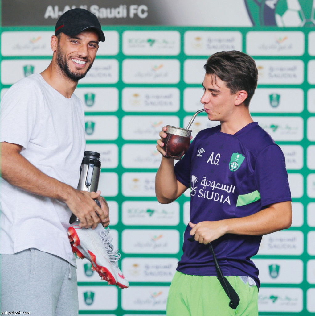 صورة التقطت أمس للسوري عمر السومة لاعب فريق الأهلي مع أكسل نجل الأرجنتيني جويدي مدرب الفريق قبل بدء التدريبات