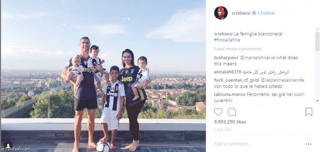 نشر البرتغالي كريستيانو رونالدو، نجم فريق يوفنتوس الإيطالي، صورة جمعته مع أفراد عائلته بقميص اليوفي بعد الانتقادات الحادة التي طالته لأدائه المتواضع في الظهور الرسمي الأول له مع الفريق أمام كييفو فيرونا. واستعان الدون بعائلته لإقناع الجماهير بدرجة إخلاصه للفريق، حيث نشر على حسابه في “إنستجرام” صورة من شرفة قصره في تورينو برفقة زوجته جورجينا رودريجيز، وأطفاله: كريستيانو جونيور، والتوأم إيفا ماريا، وماتيو، وآلانا مارتينا، وجميعهم بقمصان يوفنتوس. ونالت الصورة أكثر من تسعة ملايين إعجاب.