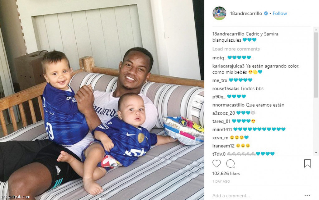 نشر البيروفي أندريه كاريلو، لاعب فريق الهلال الأول لكرة القدم، عبر حسابه على موقع "إنستجرام"، صورة جمعته بطفليه وهما يرتديان قميص الهلال. وتداولت الجماهير الهلالية الصورة على نطاق واسع، وحازت على أكثر من 100 ألف إعجاب. يذكر أن الهلال استقطب الدولي البيروفي في فترة الانتقالات الصيفية الحالية، وقدم اللاعب أداءً مميزًا في مباراة كأس السوبر أمام الاتحاد.