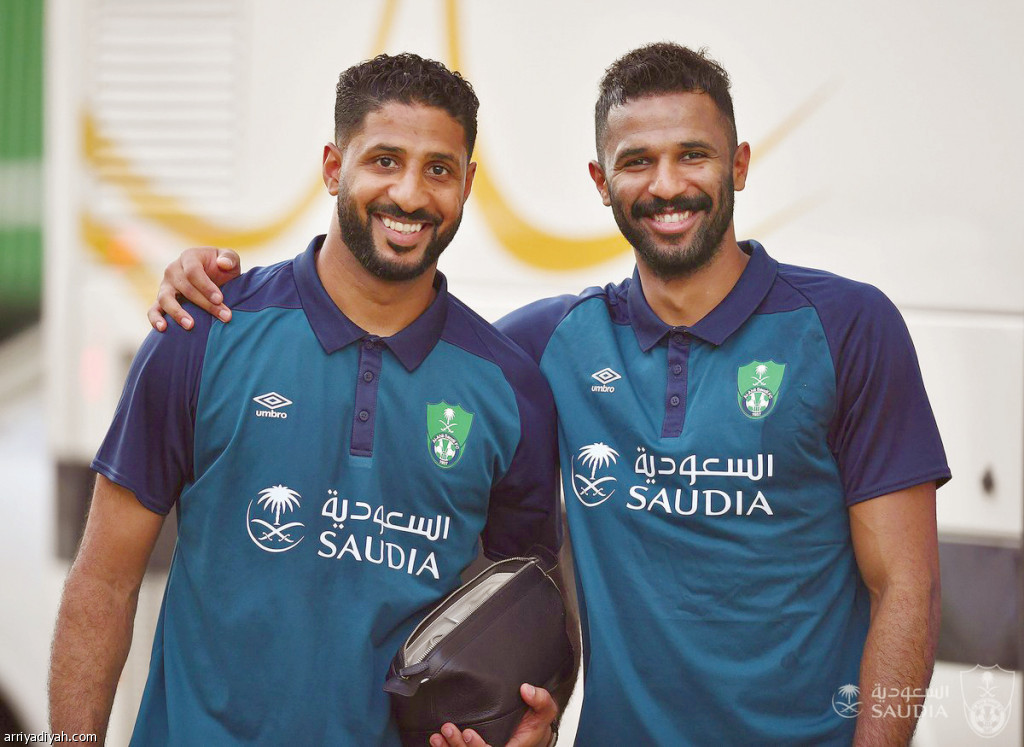 صورة التقطت أمس لياسر المسيليم ومحمد العويس حارسي مرمى فريق الأهلي الأول لكرة القدم قبل مغادرتهما إلى المنامة (المركز الإعلامي ـ الأهلي)
