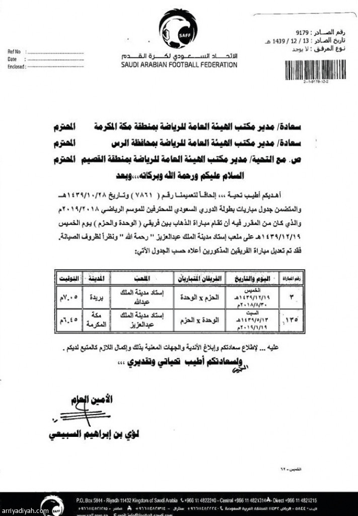 وأُرسِل القرار من الأمانة العامة للاتحاد إلى مكاتب الهيئة العامة للرياضة في مكة المكرمة والقصيم والرس ومنها إلى الناديين، ويقضي بنقل المباراة إلى بريدة واعتبارها على أرض الحزم بدلاً من الوحدة، على أن تلعب مواجهة الدور الثاني بينهما على أرض الوحدة في الشرائع في 19 يناير من العام المقبل.