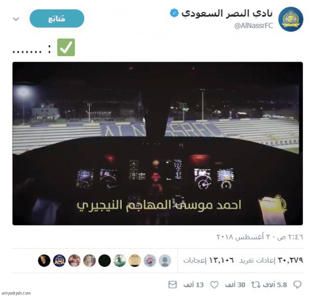 وحل في المرتبة الثانية فيديو تقديم النيجيري أحمد موسى محترف فريق النصر الأول لكرة القدم بعد أن بلغ عدد مشاهديه 2.1 مليون على حساب النادي في الطائر الأزرق، وبفارق بسيط جداً عن فيديو الإماراتي عمر عبد الرحمن محترف الهلال. يذكر أن النصر أعلن تعاقده مع النيجيري موسى في أكبر صفقة بتاريخ الكرة السعودية بعد أن وصل إجمالي مبلغ انتقال اللاعب إلى نحو 120 مليون ريال لمدة أربعة أعوام يمثل فيها النادي العاصمي.