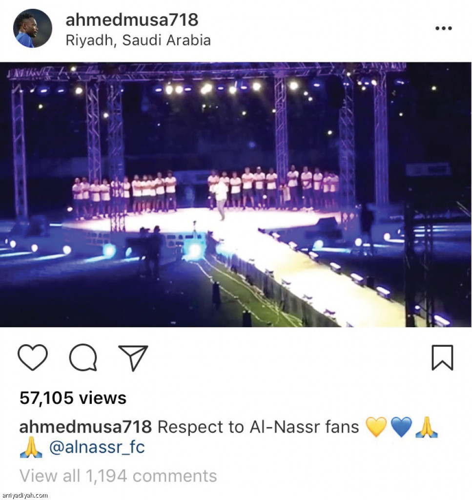 بث النيجيري أحمد موسى محترف فريق النصر الأول لكرة القدم عبر حسابه الشخصي في موقع التواصل الاجتماعي إنستجرام فيدي من احتفال الإدارة النصراوية والجماهير باللاعبين الأجانب مساء أمس الأول وعلق قائلاً: احترام كبير للنصر وجماهيره، وبلغ عدد المعجبين على الفيديو 57 ألفاً ونحو 1194 تعليقاً من متابعي النجم موسى.