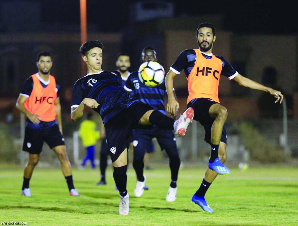 صورة التقطت أمس لثنائي فريق هجر عبد الرحمن الحريب ومحمود بوحسن خلال الحصة التدريبية التي أجراها الفريق تحت قيادة السعودي عبد الله الجنوبي مدرب الفريق تأهبا لمواجهة فريق العدالة غدا الثلاثاء في افتتاح دوري الأمير محمد بن سلمان لأندية الدرجة الأولى (المركز الإعلامي ـ هجر)