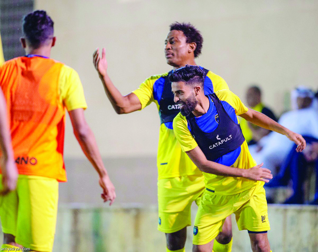 صورة التقطت أمس من تدريبات فريق التعاون.. ويظهر الثنائي عبدالمجيد السواط والكاميروني تاومبا (المركز الإعلامي ـ التعاون)
