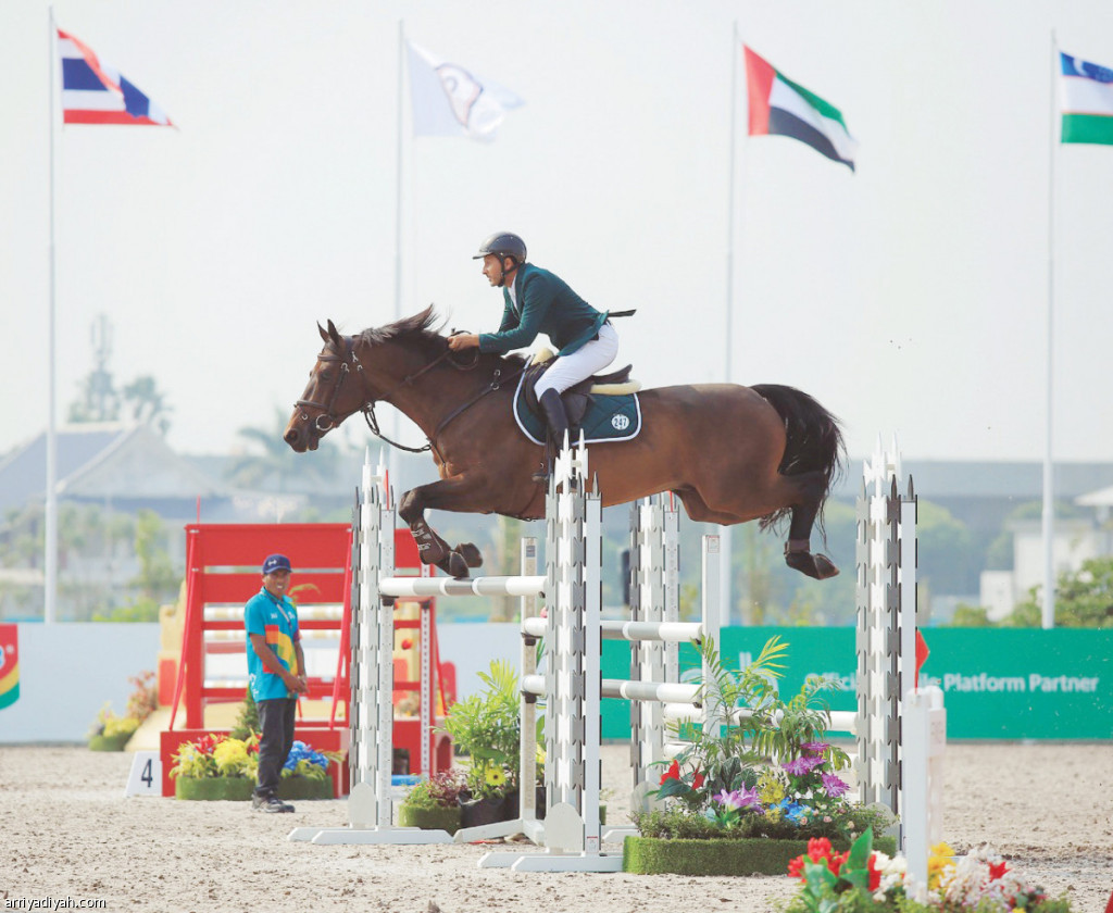 صورة التقطت أمس للفارس الدهامي خلال مشاركته في مسابقة قفز الحواجز للفرق والفردي (المركز الإعلامي ـ اللجنة الأولمبية)
