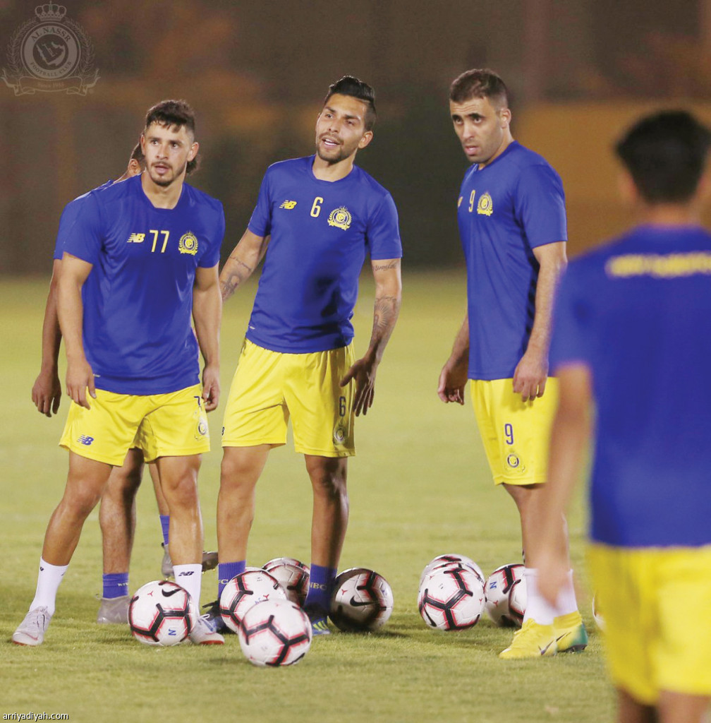 صورة التقطت أمس من تدريبات فريق النصر ويظهر فيها الثلاثي الأجنبي المغربي عبدالرزاق حمد الله والبرازيليان جوليانو وبيتروس (المركز الإعلامي ـ النصر)