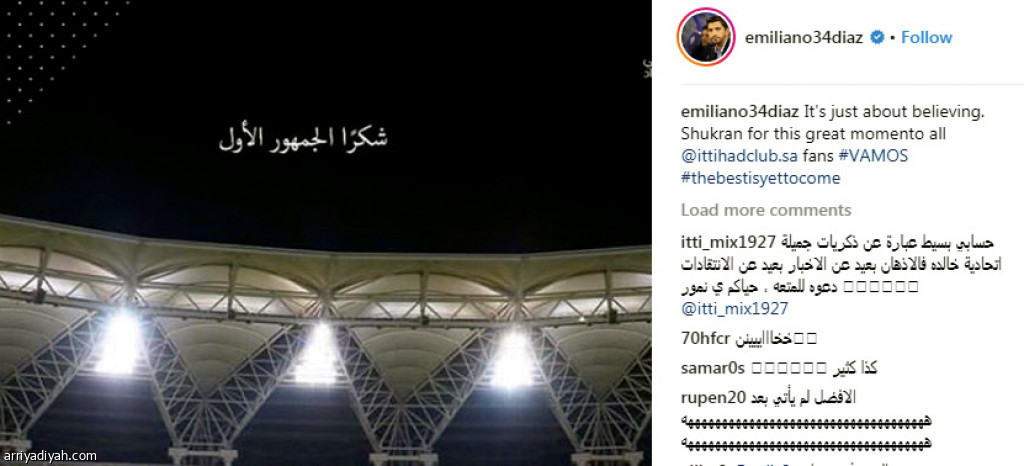 تناقلت الجماهير الاتحادية ما نشره إيمليانو دياز مساعد مدرب فريقهم الأول في حسابه الشخصي على موقع التواصل الاجتماعي “إنستجرام”. ونشر إيمليانو دياز عبر حسابه صورة لجماهير الاتحاد تملأ مدرجات ملعب الجوهرة، وأضاف تعليقاً على صورة كاتباً: “شكراً الجمهور الأول”.