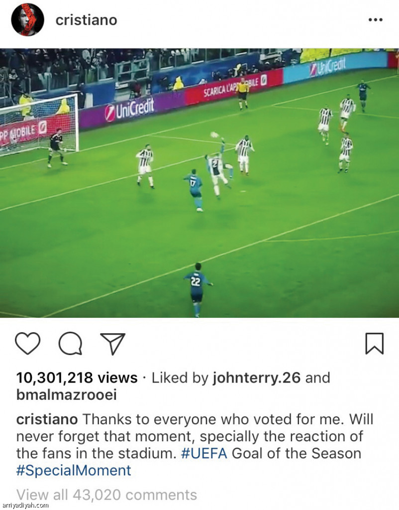 قدم البرتغالي كريستيانو رونالدو، لاعب فريق يوفنتوس الإيطالي، عبر حسابه في “إنستجرام”، شكره إلى الجماهير التي صوتت لهدفه في الموسم الماضي، عندما كان لاعبًا في ريال مدريد وسجل في شباك فريقه الحالي خلال مواجهة الفريقين في دوري الأبطال، وبلغ عدد المعجبين بالهدف الذي نشره اللاعب على حسابه 10 ملايين معجب، كما علق نحو 43 ألفًا من متابعي النجم العالمي.
